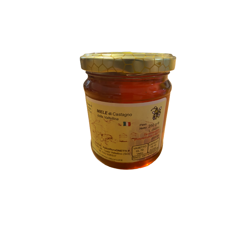 KASTANIENHONIG AUS VALTELLINA, NETTOGEWICHT 250 g Hergestellt und verpackt von :Apicoltura ONETTI P. Via Statale ,95 Cosio Valtellino (SO)- Tel. 0342 635337 Ursprungsland :ITALIEN Lagerungsbedingungen: bei Raumtemperatur an einem trockenen Ort aufbewahren DOKUMENT ANGEHÄNGT IN DER SEKTION (DOWNLOAD)