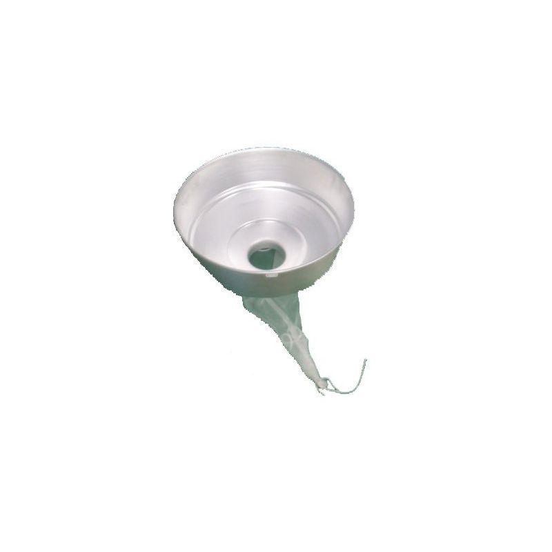 ALUMINIUM-HONIGFILTER mit Trichter - für 50 und 100 kg Reifungsmaschinen - mit kleinem Nylonfilterbeutel (Code QI S01) Durchmesser: 42 cm, Gesamthöhe 22 cm - Durchmesser für Beutelbefestigung: 10 cm OPTION: VORFILTERNETZ Durchmesser 21 cm (Code QI R07.210)