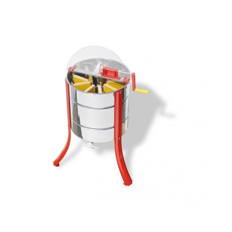 Avec panier en acier inoxydable pour 12 super cadres ou 3 cadres gigognes DADANT Ø 520 mm - Robinet de coupe en plastique de 40 mm - Fond à décharge complète No. 3 pieds amovibles peints et couvercle transparent à charnière Pour les cadres gigognes des panneaux supplémentaires sont nécessaires (Code LA 4790) NON COMPRIS OPTION : - TRANSMISSION D'ENGRENAGES CONIQUES NYLON - TRANSMISSION D'ENGRENAGES HÉLICOIDAUX