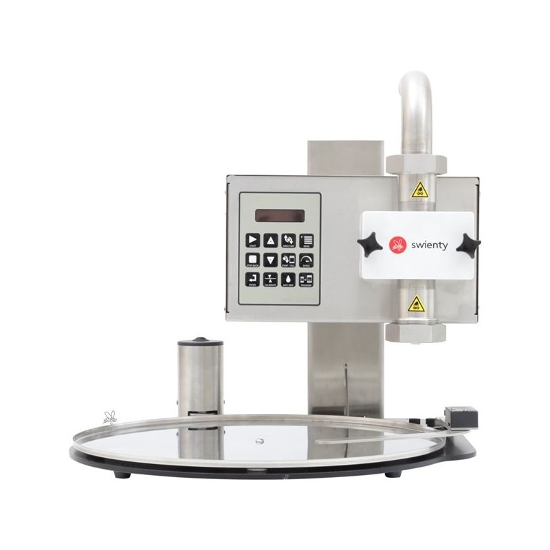 Il supporto è realizzato in robusto acciaio inossidabile e ha una guida del barattolo in plastica, a cui puoi appoggiare il barattolo, in modo che sia centrato esattamente sotto l'ugello. La guida del barattolo può anche essere regolata avanti e indietro a seconda del diametro del barattolo.