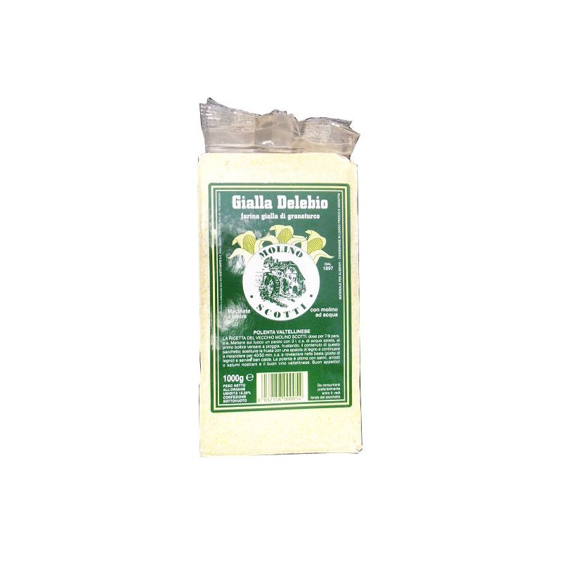 Farina gialla Delebio di granoturco "Molino Scotti" , confezione sottovuoto da 1 kg , macinata a pietra con molino ad acqua , dose per 7/8 persone.