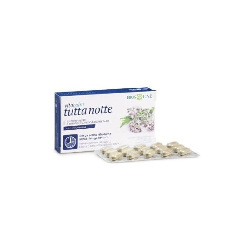 Vitacalm® Tutta Notte con Melatonina è un integratore alimentare a base di principi vegetali della tradizione erboristica, utili per favorire il rilassamento ed un sonno tranquillo.Vitacalm® Tutta Notte con Melatonina è in compresse a doppio rilascio fast/retard per favorire l’addormentamento e il riposo notturno.L’innovativa tecnologia a due strati fast/retard permette, infatti, un assorbimento graduale dei principi vegetali e un migliore utilizzo da parte dell’organismo. Lavanda, Valeriana, Escolzia e Melatonina, contenute nel primo strato a rilascio rapido, favoriscono l’addormentamento. La Passiflora, contenuta nel secondo strato a rilascio entro le 4 ore, favorisce il rilassamento e un sonno riposante.In compresse a doppio strato: