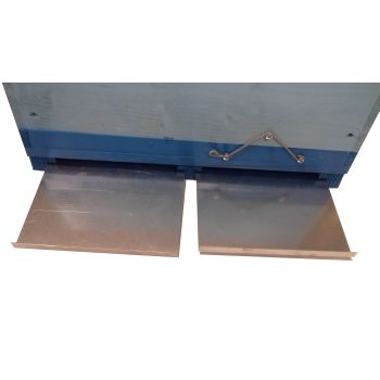 Mit 2 Beutendeckeln (einer für jedes Fach), verzinktem Blechdach, 2 Bieneneingängen, 2 Blechwannen, eine unter jedem Fach. Innenmaße der Bienenbeute: 45cm x 25,5cm h 19cm.