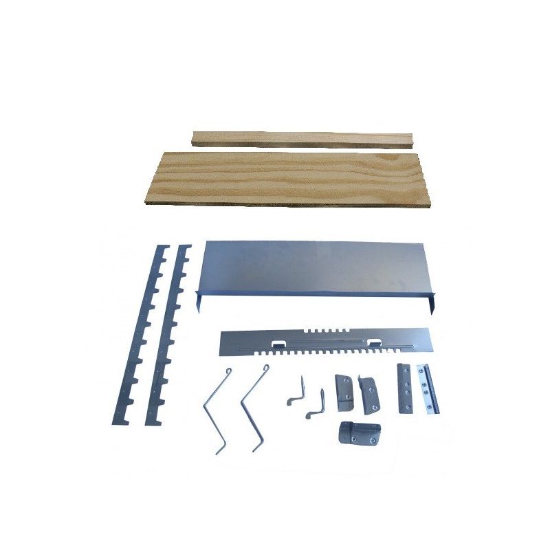 Set bestehend aus: 3 Winkel, 2 Abstandshalter mit 10 Kerben, 1 Fluglochschieber Sommer-Winter, 2 Federhaken, 2 Drehverschlüsse, 1 Abdeckung für Fluglochschieber, 2 Holzleisten zur Abstützung des Fluglochschiebers (siehe Foto) (Griffe nicht enthalten)