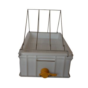 Günstiger Entdeckelungstisch mit 40 mm Absperrhahn, Höhe 20 cm, Kunststoff-Abtropfschale, Edelstahl-Entdeckelungsständer, Maße 40 × 60 × 20 cm