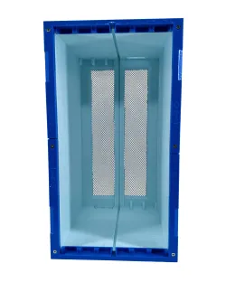 Pastellblauer Honigraum aus hochverdichtetem Polystyrol zur Verwendung mit 6-zargigen Polystyrolbeuten. Spezielle Form, die das Einsetzen und Herausnehmen des Honigraums erleichtert