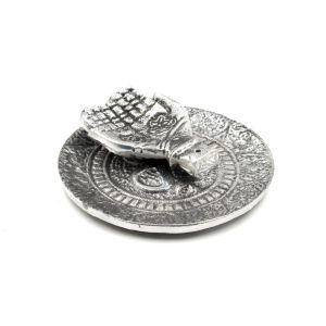 RECYCLED ALUMINIUM PLATE BURNER with HANDS Verwendung: Brenner für Räucherstäbchen Material: Recyceltes Aluminium Durchmesser: 11 cm Höhe: 2,5 cm Herkunft: Indien
