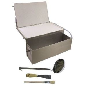 Wassergekühlte Wachsplattenmaschine, die mit flüssigem Bienenwachs arbeitet. Die Platten kommen trocken heraus. Präzise Prägung und gleichmäßige Dicke. Inklusive Zubehör: Schöpfkelle für 1 Wachsplatte, Pinsel zum Einseifen klebriger Stellen und Wachsschaber. Gebrauchsanweisung mitgeliefert. Anwendung: das flüssige Wachs auf die feste Silikonplatte gießen, die Silikonplatte falten und 20-30 Sekunden lang gedrückt halten, anheben, backen. - Modell Dadant 420 x 260 mm