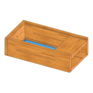 Bestehend aus 4 Kästen aus Holz, Kunststoff und Blech, die wie folgt geformt sind: -der Boden hat eine Öffnung für den Ausgang der Königinnen -zwei Holzseiten sind für die Befestigung der Wachsfolie vorbereitet -die Vorderseite hat einen abnehmbaren durchsichtigen Kunststoff -die Rückseite hat ein abnehmbares Eisengitter -die Oberseite hat eine kleine Futterstelle und einen Raum zum Einsetzen der Königinnenzellen. Das Dach ist mit Blech bedeckt; auf der Unterseite befinden sich die 4 Auslässe (einer für jeden Kern) mit 4 verschiedenen Richtungen. Außenmaße: 325x205x283 mm