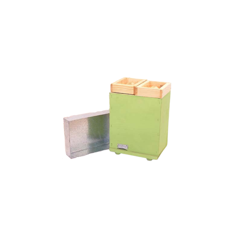 Dieser Kern besteht aus einem Nest, zwei kleinen Türen, einer vor und einer hinter dem Nest, und hat zwei paraffinbeschichtete Hohldeckel mit einem zentralen Schornstein darüber. Auf der Wabenabdeckung befindet sich eine Abdeckung aus Mauerwerk; ein elektrogeschweißtes Dach deckt beide Wabenabdeckungen ab. Ein Blech trennt die beiden Kammern. Der Holzboden hat in der Mitte ein mit Streckmetall abgedecktes Loch zur Belüftung. ANWENDUNGSWEISE: Öffnen Sie die Zarge und ersetzen Sie sie durch eine Zarge im Inneren der Bienenbeute. Lassen Sie die Rähmchen lange genug stehen, damit sich die Brut einnisten kann, und bringen Sie sie zusammen mit einigen Bienen in den Freiarbeitsstock. Die Bienen stellen fest, dass es keine Bienenkönigin gibt, und legen ihre eigene Zelle an. Das gleiche Verfahren muss für jede Zarge wiederholt werden. Am Ende der Behandlung haben Sie 2 Mini-Zellen mit befruchteter Königin. Einzige Empfehlung: Halten Sie den Ableger 3 km vom Bienenstand entfernt oder 2 Tage geschlossen.