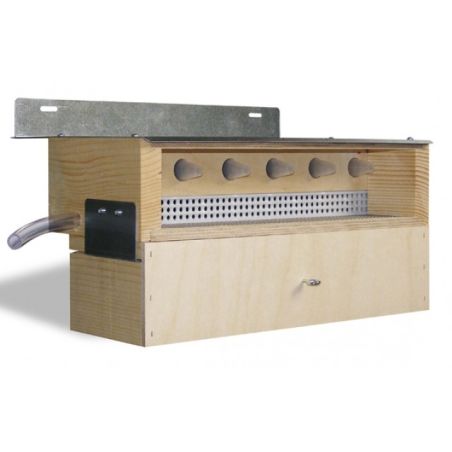 Professionelle Pollensammelfalle für Standard Bienenbeuten mit 10-zargigem Vorbau DIE NEUE POLLENSAMMELFALLE, KOMPATIBEL MIT ALLEN BESTEHENDEN BIENENBEUTEN Die verzinkte Blechhaube ragt nach vorne und schützt den in der Schublade enthaltenen Pollen vor Regen. Die Falle ruht auf der Stufe und wird mit zwei Ösenschrauben in vorbereiteten Schlitzen schnell an der Vorderwand der Bienenbeute befestigt.