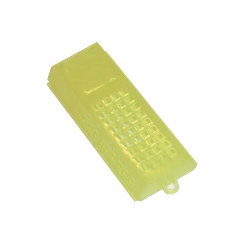 Der Käfig ist aus durchsichtigem, lebensmittelechtem Kunststoff gefertigt. Extraflaches, rechteckiges Modell. Transparente gelbe Farbe. Abmessungen: 37 X 13 X 80 mm Gewicht: 9,5 g. Der Käfig besteht aus: ? 1 Bonbon-Behälter ?1 Verschlusskappe ?1 runder Haken zur Befestigung ? 1 Satz Belüftungslöcher