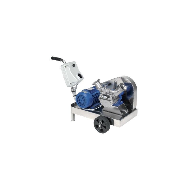 VOLUMETRISCHE DREHZAHLPUMPE MIT NIEDRIGER DREHZAHL FÜR SELBSTPREMIERENDEN HONIG aus rostfreiem Stahl mit FLEXIBELEM Gummilaufrad mit Riemenscheibenuntersetzung auf einem Rollwagen. Dieses Modell mit sehr niedriger Drehzahl (300 U/min) und mit dem Laufrad aus NR-Naturkautschuk ist besonders für HONIG geeignet. Dreiphasige Stromversorgung 400V/50Hz - 1,5 KW - 300 U/min. - Gewicht 38 Kg Anschluss 40 mm - 1"1/2 Maximale Förderhöhe: H= 16 mt Maximaler Durchfluss: 40 L/min.