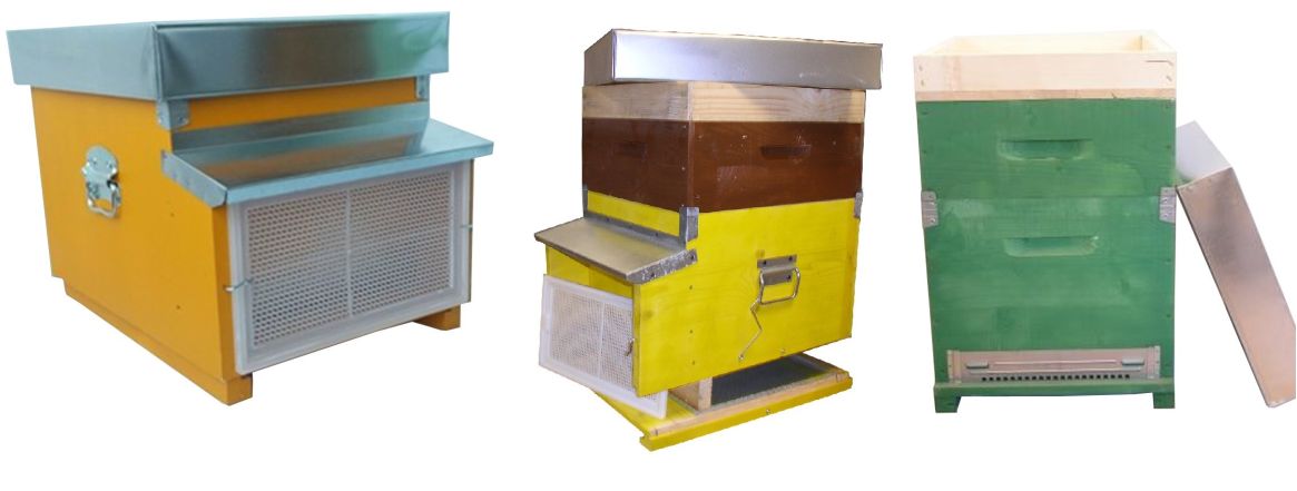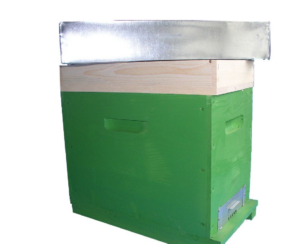 Beehives complete with wooden cable cover, wooden roof covered with sheet metal, fixed anti-moth net bottom, transport template, wood-carved handles. Without frames