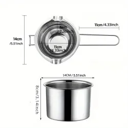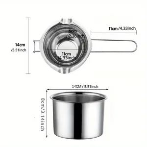 Kit for water bath melting of wax, kerosene, cake ingredients or other. Includes:- Stainless steel pot, 14 cm diameter- Stainless steel bain-marie pot with 11 cm long handle, 11 cm diameter, with two spouts