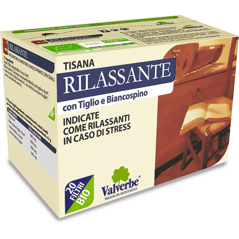 20 ORGANIC FILTERS INDICATED AS A RELAXANT IN CASE OF STRESS Dietary supplement based on medicinal plants A sip of health while respecting the environment Each filter sachet is a precious witness to Valverbe's philosophy, which follows ancient herbal traditions and uses modern production technologies , in full respect of the environment: photovoltaic roof, vegan ok and gluten free organic herbs, packaging in "knotted" filters with organic cotton thread and unbleached paper. INGREDIENTS: Lime tree honey (Tilia platyphyllos Scop.) flowers 30%, Hawthorn (Cratageus oxyacantha auct:) leaves and flowers 30%, Sweet orange (Citrus sinensis L. Osbeck) fruit, natural orange flavor