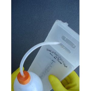 Cómo realizar el tratamiento 1) Limpie los cuadros centrales de residuos de cera y propóleos, donde se colocará el evaporador.2) Ponga la Colmena "en burbuja". 3) El evaporador "BioLetalVarroa fórmico" dispensa una cantidad muy pequeña de ácido fórmico (de liberación continua), suficiente para romper gradualmente la Varroa naciente, y no; por lo que es aconsejable realizar un tratamiento con ácido oxálico sublimado (se recomienda el sublimador BioLetalVarroa), para romper la máxima cantidad de Varroa fuera de la cría y continuar, 3-4 días después, con el tratamiento utilizando "BioLetalVarroa fórmico".4) Llenar el dosificador con la cantidad necesaria para un único tratamiento de 25 días, es decir, aproximadamente 360 g de ácido fórmico al 85%, a través de los dos orificios previstos para alojar las esponjas, colocándolo verticalmente y, a continuación, cerrarlo con los dos tapones previstos en el envase hasta su colocación en la Colmena.55.) Cuando compruebe la gota de Varroa, se recomienda no limpiar la bandeja de Varroa con un cepillo, sino trabajar con un recogedor o posiblemente usar una máscara protectora, para evitar inhalar cualquier residuo de ácido oxálico.6) Coloque el dispensador encima de los marcos en el centro de la familia, retirando las tapas de los extremos e introduciendo las dos esponjas en los orificios previstos, encajándolas verticalmente hasta que toquen el fondo.7) Cierre la colmena con la tapa invertida si está equipada con un marco de 55 mm. En caso contrario, añada un marco del mismo tamaño y cierre la colmena normalmente8) Para funcionar en condiciones óptimas, la Colmena debe protegerse con un aislante (se recomienda poliestireno s20-25mm) para evitar el sobrecalentamiento inducido por el sol, permitiendo así que el evaporador funcione exclusivamente a la temperatura natural de la familia de las abejas. 9) Para el tratamiento de los núcleos, el procedimiento es el mismo que para las colmenas. Sin embargo, se recomienda cerrar uno de los dos orificios con el tapón, introduciendo sólo una esponja de evaporación en el segundo orificio.10) Si las condiciones climáticas inducen un sobrecalentamiento excesivo, que no puede reducirse con el aislamiento, se recomienda acortar la altura de las esponjas, comprobando que la evaporación diaria no supera los 14-18 g.11) Una vez finalizado el tratamiento, se puede vaciar el recipiente del ácido residual, que puede reutilizarse para otros tratamientos.