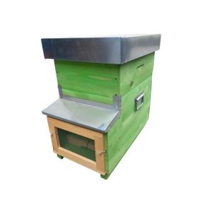 Colmena D.B. 8 FAVI STANDARD con fondo de red antitanque fijo Cubierta de nido con cubierta de disco montada de 4 posiciones en chapa galvanizada 10 cm de altura forrada de madera y faestile en la parte inferior- tejadillo en chapa galvanizadaplantilla de transporte de plástico- toldo de rejilla galvanizada- 3 ángulos de conexión- distanciadores montados en el nido- base de red antitanque móvil con fondo de chapa galvanizada desmontable- madera de abeto curada de 25 mm de grosor- paredes ensambladas con tornillos- asas para transporte- Soporte para palanca pintado