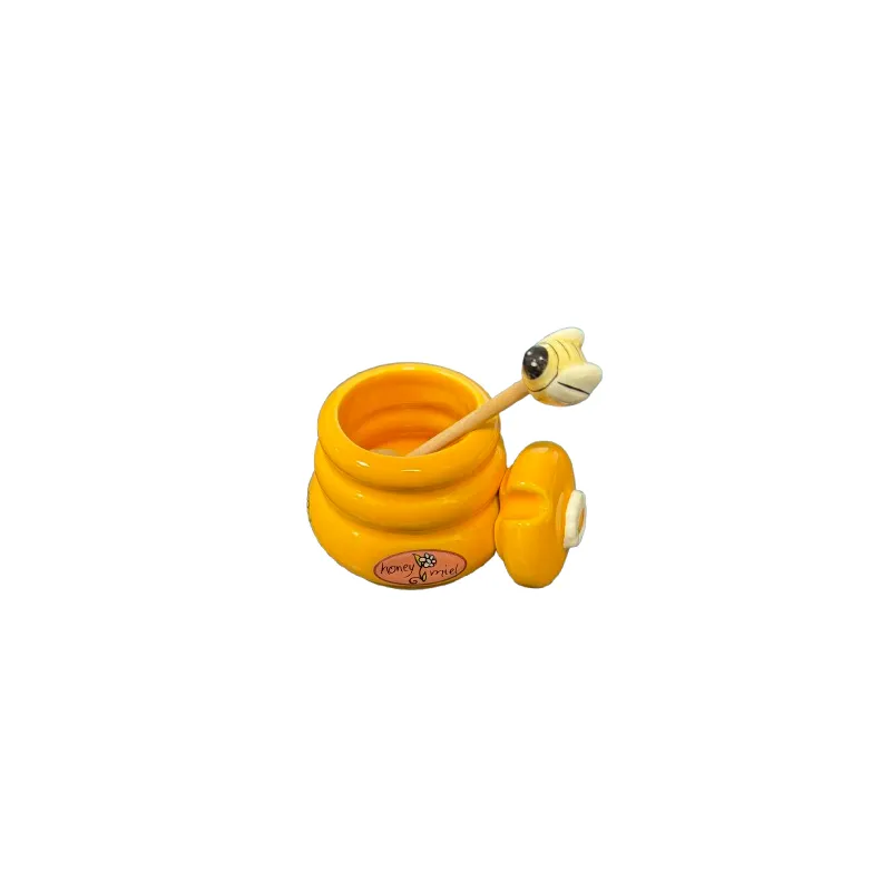 • Tarro de miel de cerámica con colector de miel de madera de abeja