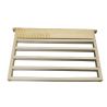 Stainless steel scraper with a serrated edge for cleaning queen excluders. Wooden handle.