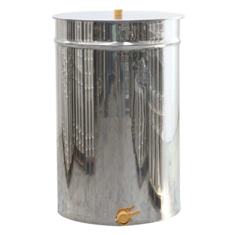 MÁQUINA DE MIEL DE ACERO INOXIDABLE 400 kg de capacidad con soldadura TIG - Diámetro 62 cm - Altura 102 cm Con virola roscada para la conexión del grifo de rosca - Tapa de acero inoxidableTapa de acero inoxidableDiámetro del grifo de rosca 40 mm a elegir entre:- Grifo de plástico/nylon (QI R05)- Grifo de acero cromado (QI R03)- Grifo de acero inoxidable (LA 6370)