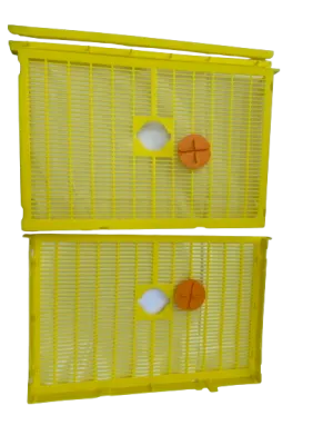 Jaula aislante para el bloque de cría del nido Plástico D.B. para insertar el marco de críaApertura en abanico para facilitar la inserción del marco de críaCon no. 2 tapas extraíbles para la inserción de la abeja reina y no. 2 tiras de cierre del marco de críaDimensiones: 44,8 x 29,6 x Grosor 5 cm