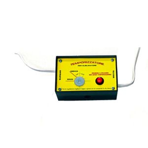 Operation The timer allows setting the sublimation time through an internal 'trimmer', accessible through the hole provided on the top, and customizable according to the type of treatment. The default time is set in the 'family' mode at 1min 50sec, which corresponds to the treatment time for families on 10-frame Beehives; it is possible to set the timer to the nuclei mode by setting the trimmer to the 'core' position, which corresponds to 1min 20sec, with the help of the supplied accessory. By turning the same trimmer clockwise (to increase the time) and counterclockwise (to decrease the time), a duration from 0min to 5min can also be programmed. The end of the set treatment period is signaled by an audible warning emitted by a 'buzzer' inside the timer; it is possible to start a new treatment by pressing the 'start' button located on the top of the timer, which interrupts the buzzer and starts counting the set treatment time again. Installation The timer should be installed on the sublimator cable, and its location can be freely chosen by the beekeeper according to his or her preferences. However, it is important that the - polarity (blue wire) and + polarity (brown wire) are respected for the timer to operate properly. It is also possible to control 1 or 2 sublimators with a single timer by connecting the two wires of the same sublimators in and out. Two locations are recommended for the installation of the timer on the cable: - Close to the battery, if it is moved continuously near the beekeeper; - Close to the sublimators, leaving enough cable for the beekeeper to make the moves from one Beehive to another