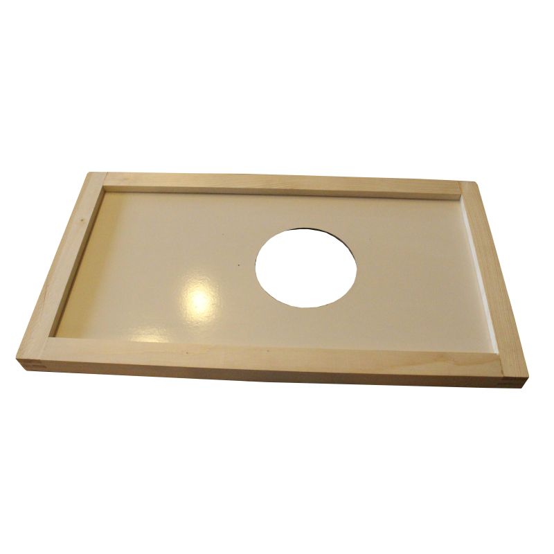 TABLE EN BOIS UNIQUEMENT pour ruche 6 cadres D.B. - sans soupape ascendante OPTIONS : - UNIQUEMENT TROU CENTRAL diamètre 11,3 cm pour ruche ronde - AVEC LAMPE EN PLASTIQUE RONDE A 2 VOIES (Code FO 2121) - Dimension : 27 x 50 cm épaisseur 3 cm