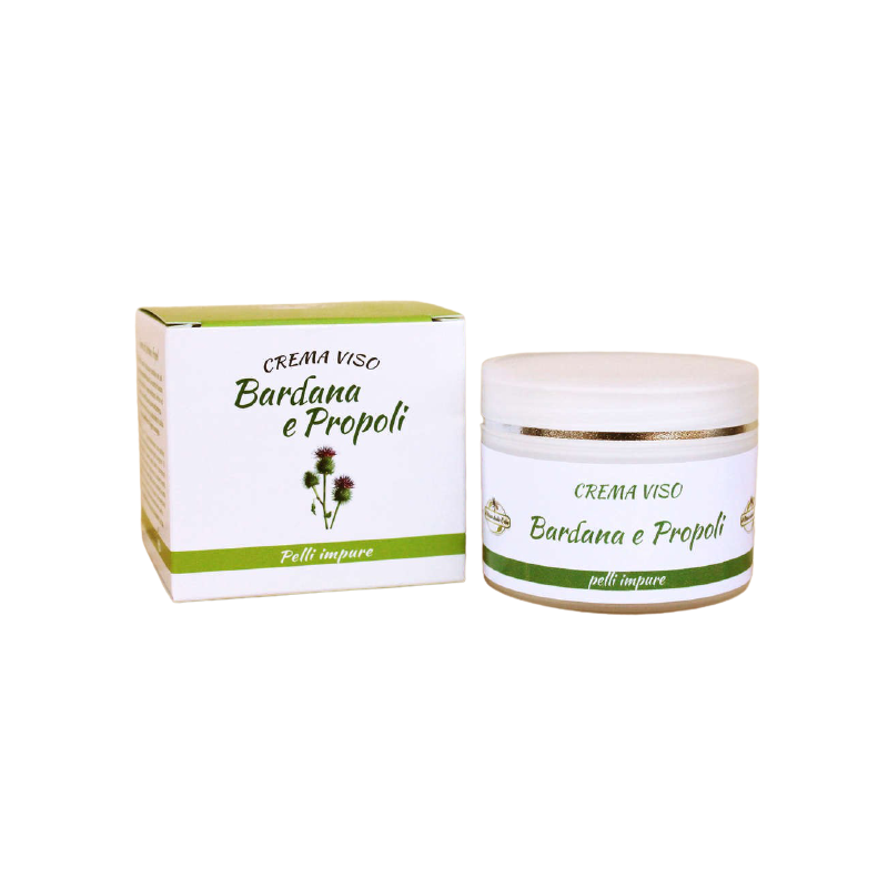 Crème pour le visage à la bardane et à la propolis pour les peaux impures. INDICATIONS : crème d'application quotidienne pour les peaux impures avec hypersécrétion sébacée. A l'extrait de bardane et de propolis : purifiant, séborégulateur, apaisant et antiseptique. Contient du Ticlosan à action antibactérienne. MODE D'EMPLOI : Appliquer la crème sur le visage et le cou, après les avoir nettoyés, en massant légèrement.