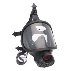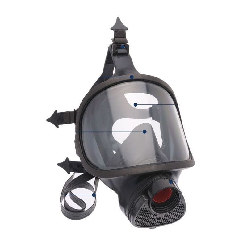 MASQUE COMPLET EN 136 CLASSE 3 EN FILET DE CAOUTCHOUC NOIR. RÉFLECTEUR EN 148/1 (TR82) équipé d'un raccord fileté standardisé, utilisable avec tous les appareils respiratoires équipés d'un raccord mâle EN 148-1 (filtres à gaz et à poussières, appareils à air comprimé à pression négative). Conforme à la norme EN136:1998 et à la directive 89/686/CEE Filtre NON COMPRIS (Code PI 0598)