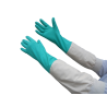 GANTS SOLVANTS AUX NORMES CE CATEGORIE II - Gants en nitrile vert, sans latex, anti-allergiques. Longueur mm. 330, épaisseur 0,40 mm, avec l'ajout de la manchette en tissu de coton cm 20 avec manchette à l'extrémité cm 6 Tailles disponibles : S/7 - M/8 - L/9 - XL/10 - XXL/11. Certifié CE II Catégorie EN388 risque mécanique niveaux de résistance 4.0.2 EN374 risque chimique et biologique et pour le contact avec les denrées alimentaires.