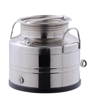 Fût à huile CONTAINER acier inoxydable 18/10 (AISI 304)- Ø 304 mm - épaisseur 0,6 mm - hauteur 234 mm - ouverture 200 mm - 10 Préparé pour robinet 1/2" (NON COMPRIS) (Code QI R21) et (Code 4F RUB1) Grande ouverture supérieure (Ø 200 mm) pour faciliter le remplissage et le nettoyage. Idéal pour le stockage et le transport de l'huile, du vin, des spiritueux ou de l'eau. OPTIONS:- Soudé TIG : fond soudé pour une meilleure hygiène, équipé d'un "couvercle de fond" en plastique qui permet de déplacer le fût sans endommager le fond. Entièrement soudé TIG. -Agrafé : fond soudé pour une meilleure hygiène, équipé d'un couvercle de fond en plastique qui permet de déplacer le fût sans endommager le fond.