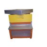 Ruche D.B. peinte à 12 cadres, avec cadres de nid et de couvain. Complète avec :Nid ; alvéoles ; couvercle en bois avec disque en tôle monté à 4 positions ; couvercle en tôle galvanisée de 10 cm de haut, doublé de bois et de faestile sur le fond ; auvent en tôle galvanisée ; cadres dans le nid et dans les alvéoles avec fil de fer sans cire ; masque de transport en plastique ; roues à picots galvanisées. porte métallique ; 3 angles de raccordement ; entretoises montées dans le nid et dans l'alvéole ; fond fixe en filet anti-mites avec fond en tôle galvanisée amovible par l'arrière ; bois d'épicéa séché de 25 mm d'épaisseur ; parois assemblées avec des vis ; poignées pour le transport ; Repose-lève