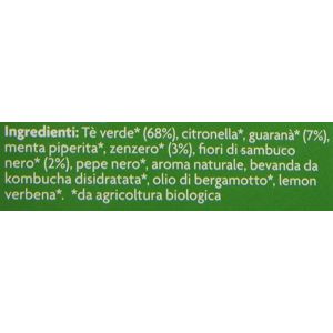 Ingrédients : Thé vert* (65%), citronnelle*, guarana* (7%), menthe poivrée*, fleur de sureau noir* (3%), gingembre* (2,5%), arôme naturel de fraise, poivre noir*, boisson kombucha déshydratée*, huile de bergamote*, verveine citronnelle*, huile essentielle de citron*, gousses de vanille*, arôme naturel de vanille, extrait naturel de fruit de la passion. (*Biologique)