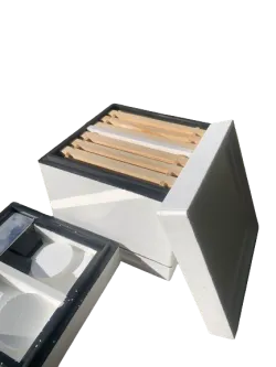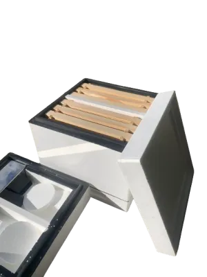 ARNIA DI FECONDAZIONE in POLISTIROLO per 2 NUCLEI COMPLETA DI 3 TELAINI mezzi melario ognuno, 2 entrate separate fronte e retro per i 2 nuclei, NUTRITORE e COPRIFAVO 'LYSON' - Dimensioni 30 x 30 x H 35 cm
