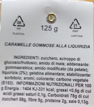 Ingredienti: zucchero, sciroppo di glucosio/fruttosio, amido di mais, addensante: gommaarabica, amido modificato (da patate), liquirizia (2%), gelatina alimentare, stabilizzante, sorbitolo, aromi, colorante: carbone vegetale.