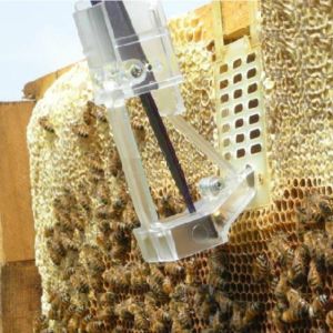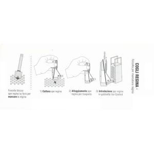 Cogli regina con forcella blocca regina per la marcatura La forcella permette di bloccare l'ape regina sul favo per marcarla. L'ape regina viene catturata e fatta alloggiare nel kit per il trasporto. Poi è introdotta nella gabbietta per il blocco covata mozzato (MO 001) grazie a questo cogli regina.