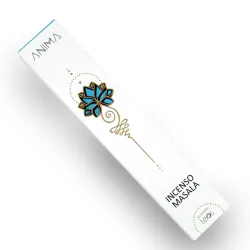 L'incenso masala viene prodotto artigianalmente come da tradizione, miscelando polveri lignee e vegetali (resine, muschi, radici, fiori) essenze e carbone vegetale. L'amalgama viene poi arrotolata su bastoncini di bamboo essiccati all'ombra. Confezione da 15g
