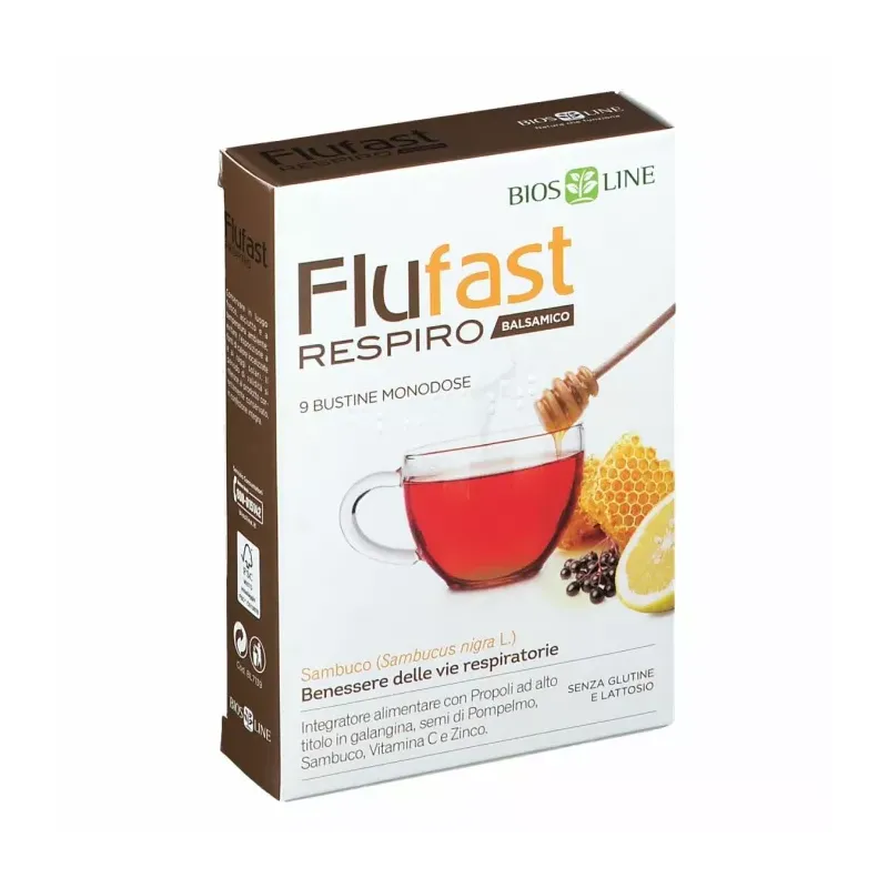 Flufast Respiro, associa le ben note proprietà della Propoli a quelle antiossidanti dei semi di Pompelmo, ricchi in bioflavonoidi. Contiene inoltre Sambuco, Miele, oli essenziali, Vitamina C e Zinco. L’estratto di Sambuco è utile per il benessere delle vie respiratorie e per favorire la fluidificazione delle secrezioni bronchiali. Gli oli essenziali di Eucalipto, Menta e Timo svolgono un’azione balsamica, emolliente e lenitiva contribuendo al benessere di naso e gola. La Vitamina C e lo Zinco sono utili alle normali funzioni del sistema immunitario.È un valido aiuto da prendere ai primi disturbi della stagione fredda, soprattutto in caso di naso chiuso e vie aeree congestionate: unisce all’efficacia dei suoi ingredienti i benefici di una bevanda calda. Flufast Respiro, infatti, è in pratiche bustine da sciogliere in acqua calda e bere subito per sfruttare al meglio le proprietà degli oli essenziali.Nella versione classica Flufast Respiro Balsamico, indicata a partire dai 12 anni e nella versione Arancia, indicata già a partire dai 3 anni.